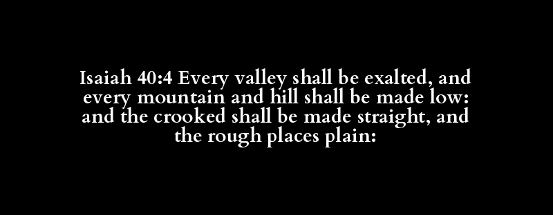 Isaiah 40:4 Every valley shall be exalted, and every mountain and hill shall be made low: and the crooked shall be made straight, and the rough places plain: