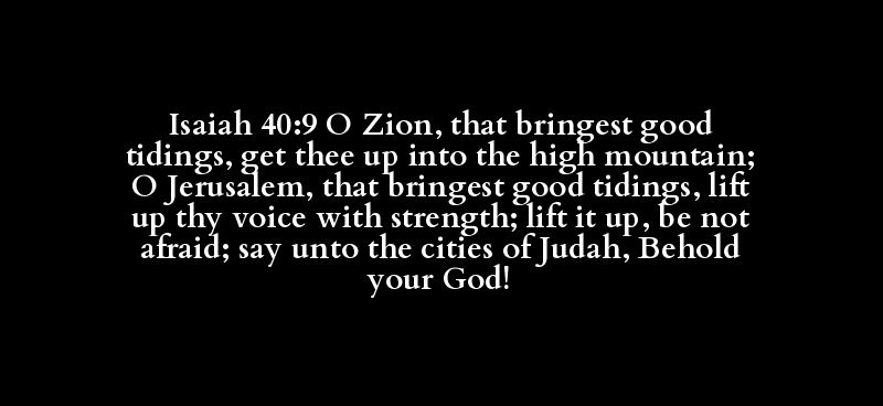 Isaiah 40:9 O Zion, that bringest good tidings, get thee up into the high mountain; O Jerusalem, that bringest good tidings, lift up thy voice with strength; lift it up, be not afraid; say unto the cities of Judah, Behold your God!