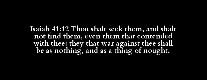 Isaiah 41:12 Thou shalt seek them, and shalt not find them, even them that contended with thee: they that war against thee shall be as nothing, and as a thing of nought.
