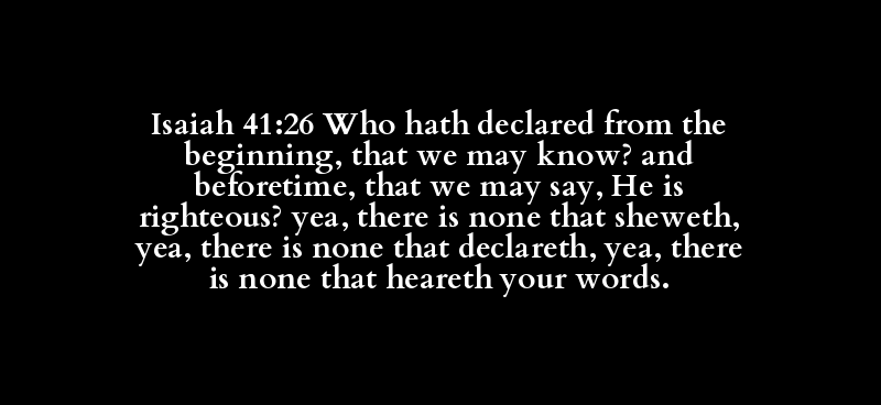 Isaiah 41:26 Who hath declared from the beginning, that we may know? and beforetime, that we may say, He is righteous? yea, there is none that sheweth, yea, there is none that declareth, yea, there is none that heareth your words.
