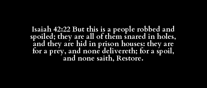 Isaiah 42:22 But this is a people robbed and spoiled; they are all of them snared in holes, and they are hid in prison houses: they are for a prey, and none delivereth; for a spoil, and none saith, Restore.