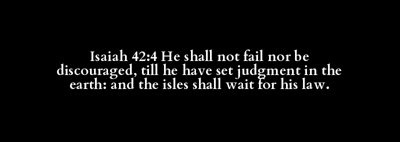 Isaiah 42:4 He shall not fail nor be discouraged, till he have set judgment in the earth: and the isles shall wait for his law.