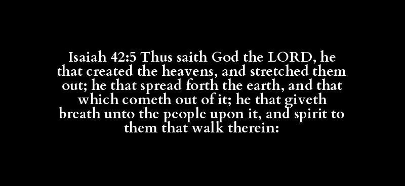 Isaiah 42:5 Thus saith God the LORD, he that created the heavens, and stretched them out; he that spread forth the earth, and that which cometh out of it; he that giveth breath unto the people upon it, and spirit to them that walk therein: