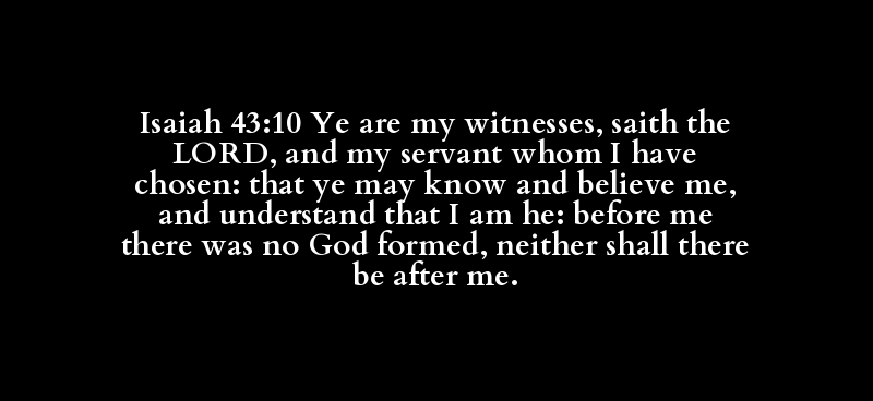 Isaiah 43:10 Ye are my witnesses, saith the LORD, and my servant whom I have chosen: that ye may know and believe me, and understand that I am he: before me there was no God formed, neither shall there be after me.