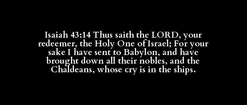 Isaiah 43:14 Thus saith the LORD, your redeemer, the Holy One of Israel; For your sake I have sent to Babylon, and have brought down all their nobles, and the Chaldeans, whose cry is in the ships.