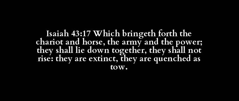 Isaiah 43:17 Which bringeth forth the chariot and horse, the army and the power; they shall lie down together, they shall not rise: they are extinct, they are quenched as tow.