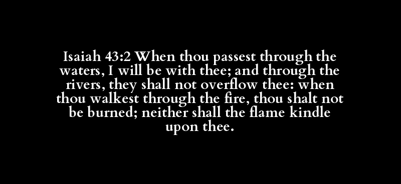Isaiah 43:2 When thou passest through the waters, I will be with thee; and through the rivers, they shall not overflow thee: when thou walkest through the fire, thou shalt not be burned; neither shall the flame kindle upon thee.