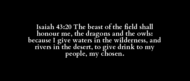 Isaiah 43:20 The beast of the field shall honour me, the dragons and the owls: because I give waters in the wilderness, and rivers in the desert, to give drink to my people, my chosen.