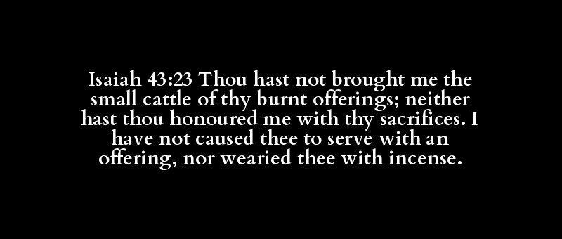 Isaiah 43:23 Thou hast not brought me the small cattle of thy burnt offerings; neither hast thou honoured me with thy sacrifices. I have not caused thee to serve with an offering, nor wearied thee with incense.