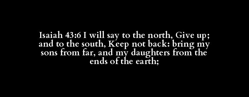 Isaiah 43:6 I will say to the north, Give up; and to the south, Keep not back: bring my sons from far, and my daughters from the ends of the earth;