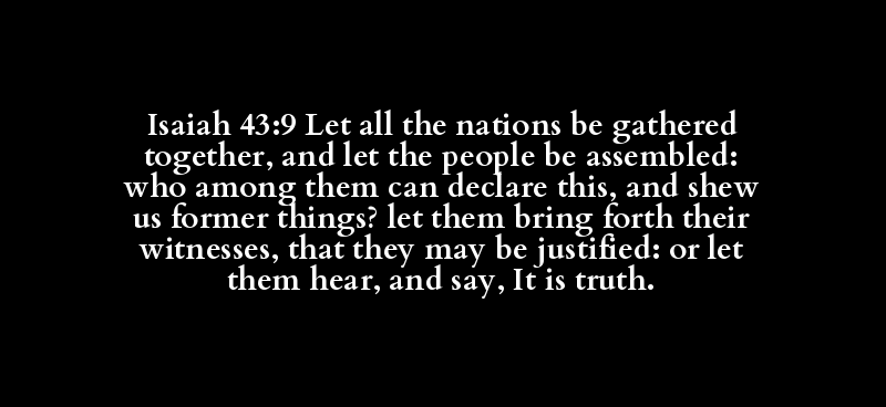 Isaiah 43:9 Let all the nations be gathered together, and let the people be assembled: who among them can declare this, and shew us former things? let them bring forth their witnesses, that they may be justified: or let them hear, and say, It is truth.
