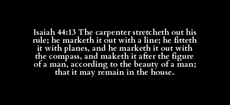Isaiah 44:13 The carpenter stretcheth out his rule; he marketh it out with a line; he fitteth it with planes, and he marketh it out with the compass, and maketh it after the figure of a man, according to the beauty of a man; that it may remain in the house.