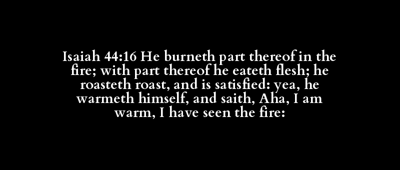 Isaiah 44:16 He burneth part thereof in the fire; with part thereof he eateth flesh; he roasteth roast, and is satisfied: yea, he warmeth himself, and saith, Aha, I am warm, I have seen the fire: