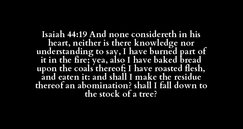 Isaiah 44:19 And none considereth in his heart, neither is there knowledge nor understanding to say, I have burned part of it in the fire; yea, also I have baked bread upon the coals thereof; I have roasted flesh, and eaten it: and shall I make the residue thereof an abomination? shall I fall down to the stock of a tree?