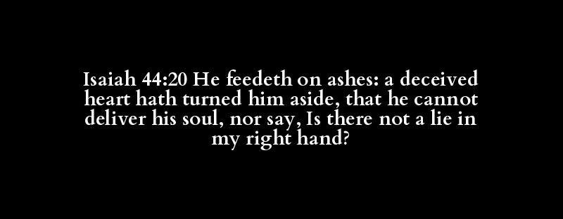 Isaiah 44:20 He feedeth on ashes: a deceived heart hath turned him aside, that he cannot deliver his soul, nor say, Is there not a lie in my right hand?