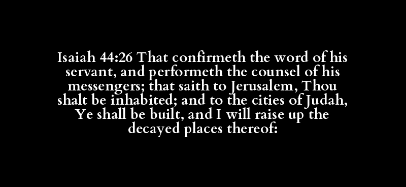 Isaiah 44:26 That confirmeth the word of his servant, and performeth the counsel of his messengers; that saith to Jerusalem, Thou shalt be inhabited; and to the cities of Judah, Ye shall be built, and I will raise up the decayed places thereof: