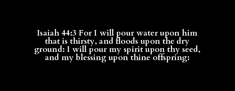 Isaiah 44:3 For I will pour water upon him that is thirsty, and floods upon the dry ground: I will pour my spirit upon thy seed, and my blessing upon thine offspring: