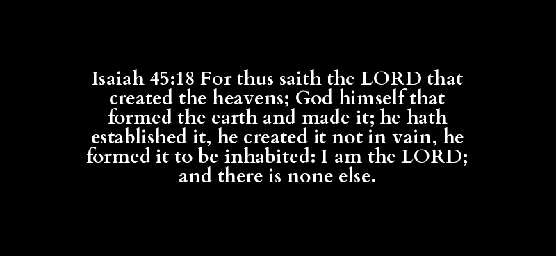 Isaiah 45:18 For thus saith the LORD that created the heavens; God himself that formed the earth and made it; he hath established it, he created it not in vain, he formed it to be inhabited: I am the LORD; and there is none else.