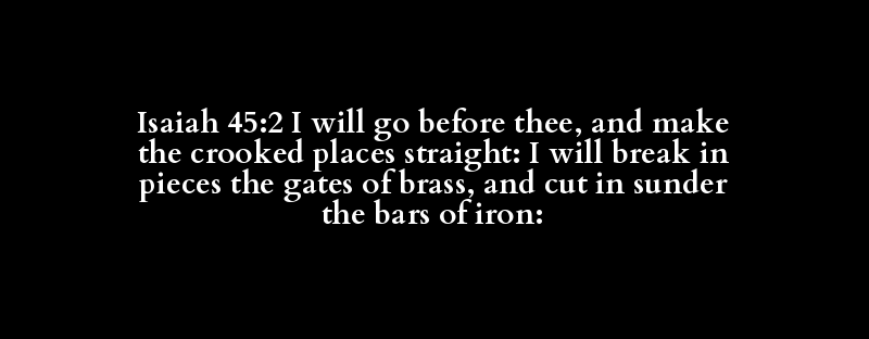 Isaiah 45:2 I will go before thee, and make the crooked places straight: I will break in pieces the gates of brass, and cut in sunder the bars of iron: