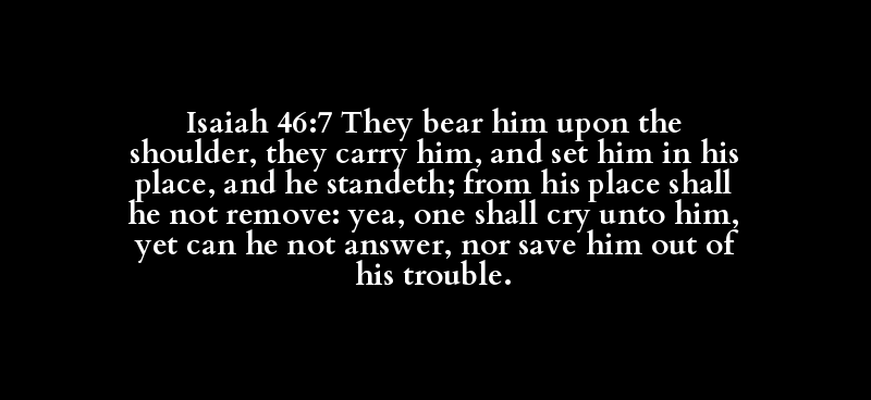 Isaiah 46:7 They bear him upon the shoulder, they carry him, and set him in his place, and he standeth; from his place shall he not remove: yea, one shall cry unto him, yet can he not answer, nor save him out of his trouble.