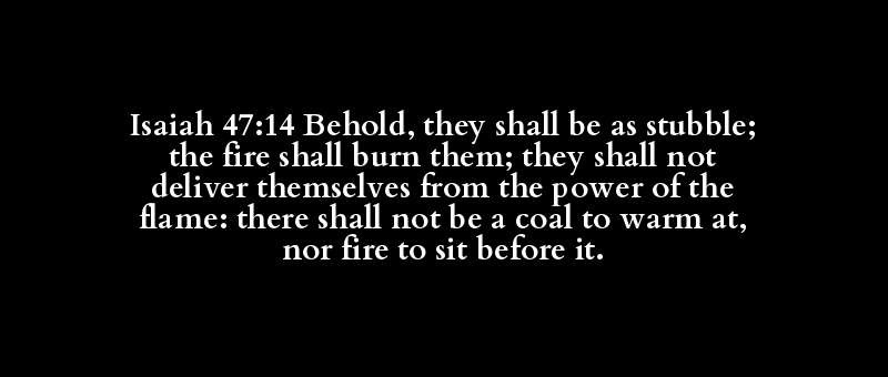 Isaiah 47:14 Behold, they shall be as stubble; the fire shall burn them; they shall not deliver themselves from the power of the flame: there shall not be a coal to warm at, nor fire to sit before it.