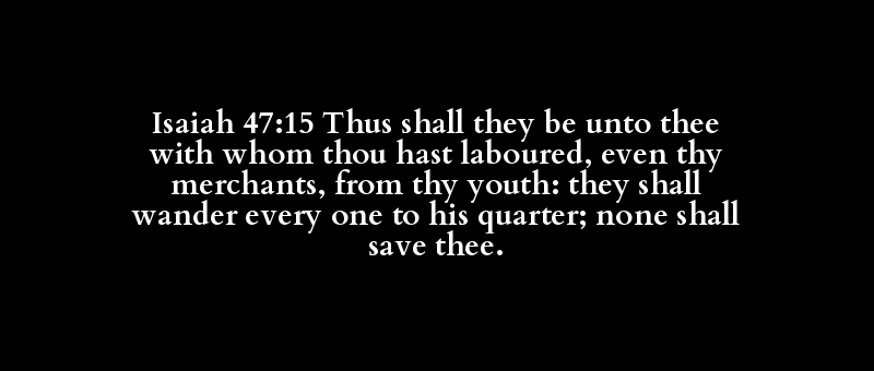 Isaiah 47:15 Thus shall they be unto thee with whom thou hast laboured, even thy merchants, from thy youth: they shall wander every one to his quarter; none shall save thee.