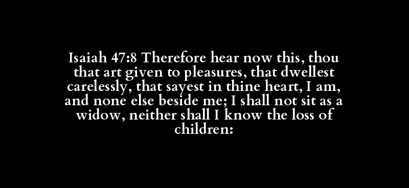 Isaiah 47:8 Therefore hear now this, thou that art given to pleasures, that dwellest carelessly, that sayest in thine heart, I am, and none else beside me; I shall not sit as a widow, neither shall I know the loss of children: