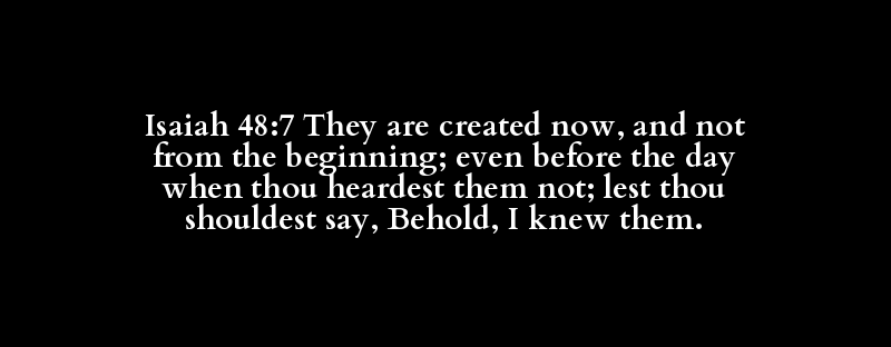 Isaiah 48:7 They are created now, and not from the beginning; even before the day when thou heardest them not; lest thou shouldest say, Behold, I knew them.