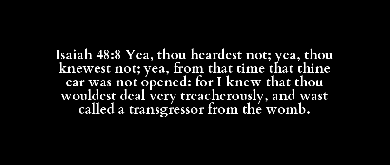 Isaiah 48:8 Yea, thou heardest not; yea, thou knewest not; yea, from that time that thine ear was not opened: for I knew that thou wouldest deal very treacherously, and wast called a transgressor from the womb.