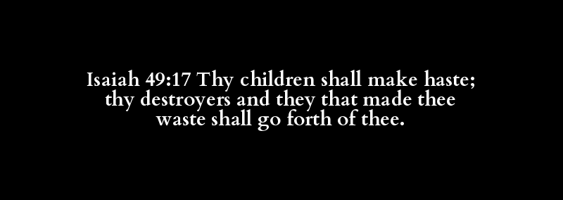Isaiah 49:17 Thy children shall make haste; thy destroyers and they that made thee waste shall go forth of thee.