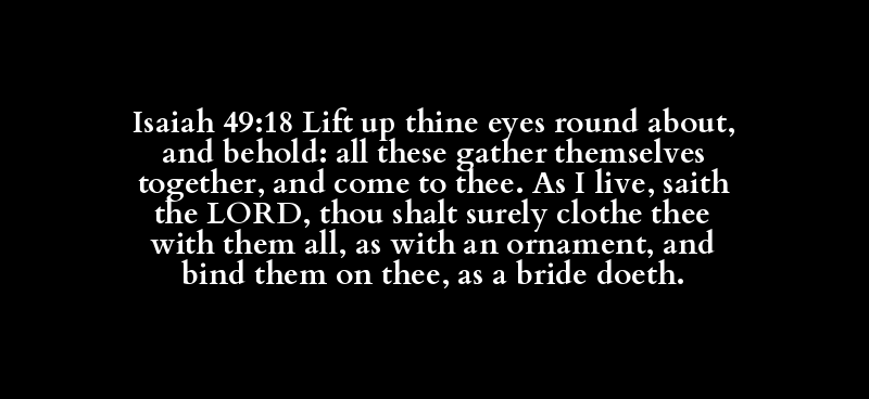 Isaiah 49:18 Lift up thine eyes round about, and behold: all these gather themselves together, and come to thee. As I live, saith the LORD, thou shalt surely clothe thee with them all, as with an ornament, and bind them on thee, as a bride doeth.