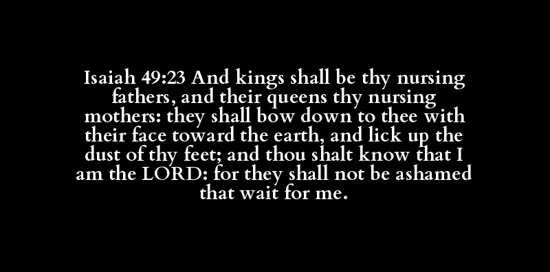 Isaiah 49:23 And kings shall be thy nursing fathers, and their queens thy nursing mothers: they shall bow down to thee with their face toward the earth, and lick up the dust of thy feet; and thou shalt know that I am the LORD: for they shall not be ashamed that wait for me.
