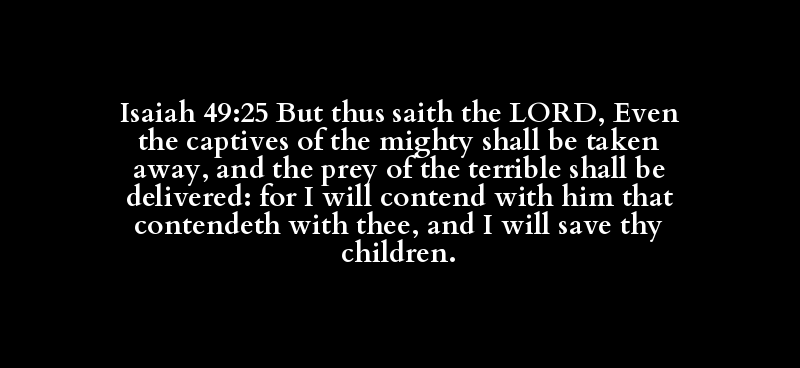 Isaiah 49:25 But thus saith the LORD, Even the captives of the mighty shall be taken away, and the prey of the terrible shall be delivered: for I will contend with him that contendeth with thee, and I will save thy children.
