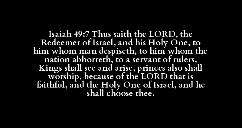 Isaiah 49:7 Thus saith the LORD, the Redeemer of Israel, and his Holy One, to him whom man despiseth, to him whom the nation abhorreth, to a servant of rulers, Kings shall see and arise, princes also shall worship, because of the LORD that is faithful, and the Holy One of Israel, and he shall choose thee.