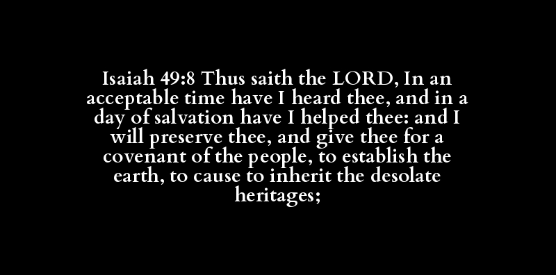 Isaiah 49:8 Thus saith the LORD, In an acceptable time have I heard thee, and in a day of salvation have I helped thee: and I will preserve thee, and give thee for a covenant of the people, to establish the earth, to cause to inherit the desolate heritages;