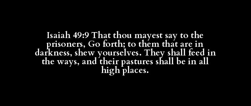 Isaiah 49:9 That thou mayest say to the prisoners, Go forth; to them that are in darkness, shew yourselves. They shall feed in the ways, and their pastures shall be in all high places.