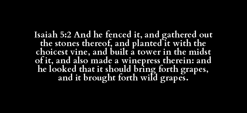 Isaiah 5:2 And he fenced it, and gathered out the stones thereof, and planted it with the choicest vine, and built a tower in the midst of it, and also made a winepress therein: and he looked that it should bring forth grapes, and it brought forth wild grapes.