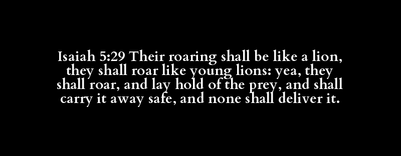 Isaiah 5:29 Their roaring shall be like a lion, they shall roar like young lions: yea, they shall roar, and lay hold of the prey, and shall carry it away safe, and none shall deliver it.