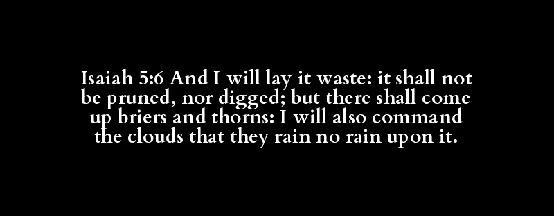 Isaiah 5:6 And I will lay it waste: it shall not be pruned, nor digged; but there shall come up briers and thorns: I will also command the clouds that they rain no rain upon it.