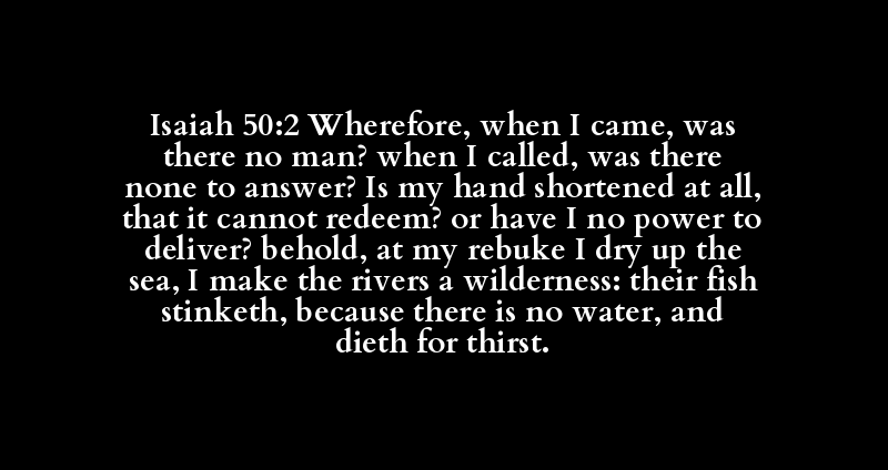 Isaiah 50:2 Wherefore, when I came, was there no man? when I called, was there none to answer? Is my hand shortened at all, that it cannot redeem? or have I no power to deliver? behold, at my rebuke I dry up the sea, I make the rivers a wilderness: their fish stinketh, because there is no water, and dieth for thirst.