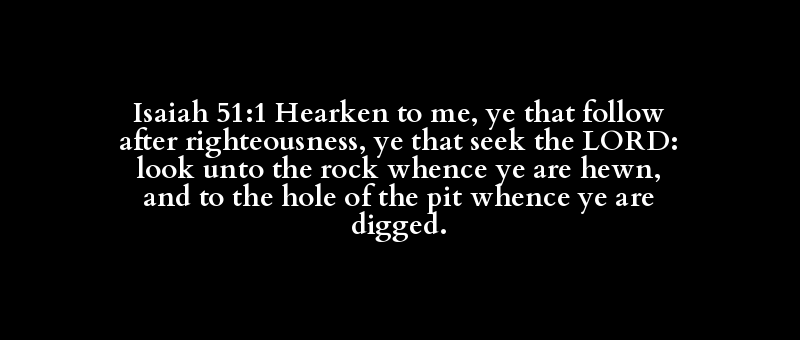 Isaiah 51:1 Hearken to me, ye that follow after righteousness, ye that seek the LORD: look unto the rock whence ye are hewn, and to the hole of the pit whence ye are digged.