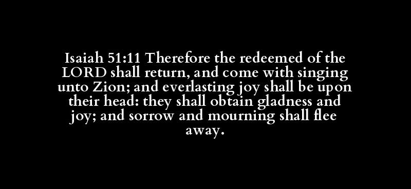 Isaiah 51:11 Therefore the redeemed of the LORD shall return, and come with singing unto Zion; and everlasting joy shall be upon their head: they shall obtain gladness and joy; and sorrow and mourning shall flee away.