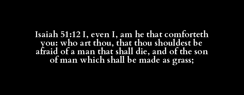 Isaiah 51:12 I, even I, am he that comforteth you: who art thou, that thou shouldest be afraid of a man that shall die, and of the son of man which shall be made as grass;