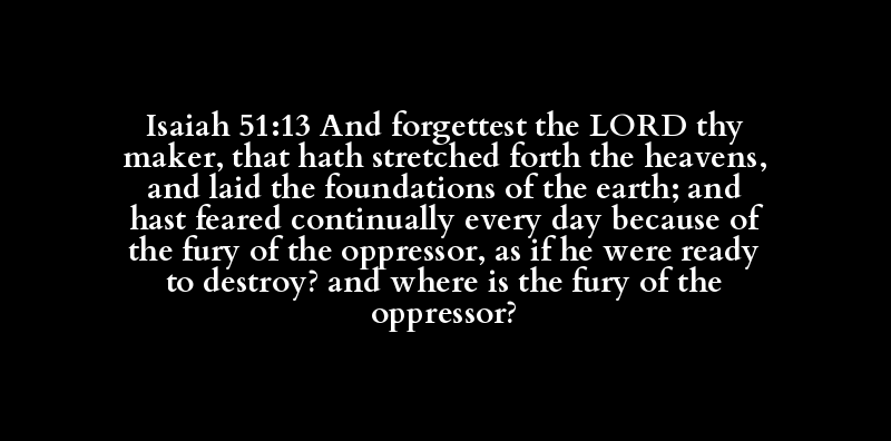Isaiah 51:13 And forgettest the LORD thy maker, that hath stretched forth the heavens, and laid the foundations of the earth; and hast feared continually every day because of the fury of the oppressor, as if he were ready to destroy? and where is the fury of the oppressor?