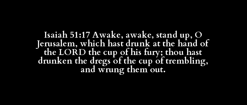Isaiah 51:17 Awake, awake, stand up, O Jerusalem, which hast drunk at the hand of the LORD the cup of his fury; thou hast drunken the dregs of the cup of trembling, and wrung them out.