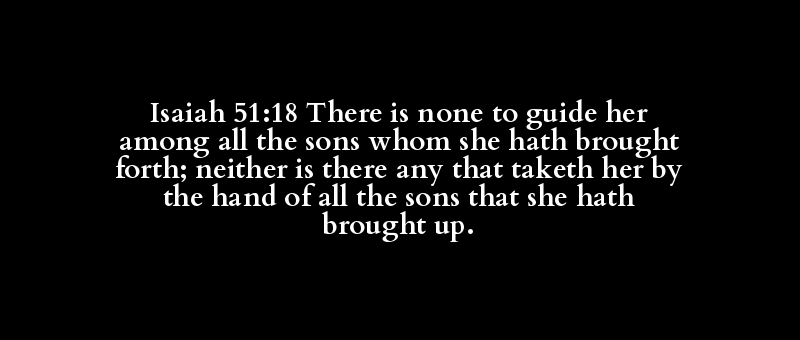 Isaiah 51:18 There is none to guide her among all the sons whom she hath brought forth; neither is there any that taketh her by the hand of all the sons that she hath brought up.