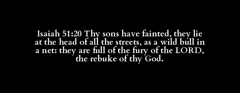 Isaiah 51:20 Thy sons have fainted, they lie at the head of all the streets, as a wild bull in a net: they are full of the fury of the LORD, the rebuke of thy God.