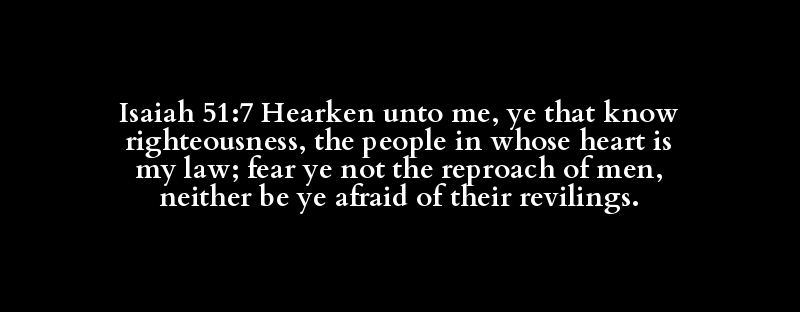 Isaiah 51:7 Hearken unto me, ye that know righteousness, the people in whose heart is my law; fear ye not the reproach of men, neither be ye afraid of their revilings.