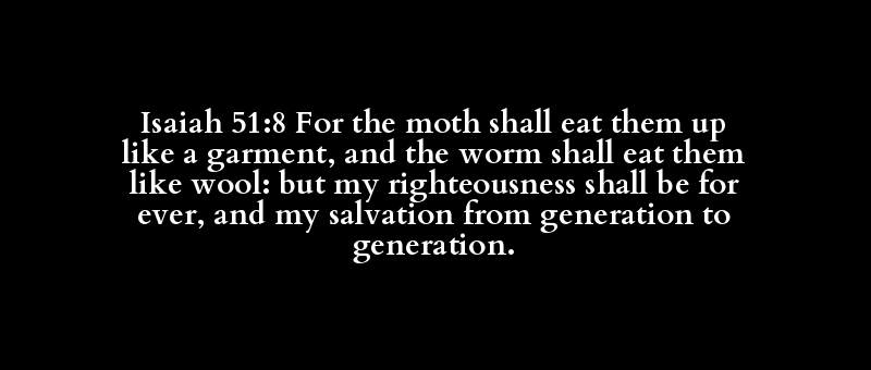 Isaiah 51:8 For the moth shall eat them up like a garment, and the worm shall eat them like wool: but my righteousness shall be for ever, and my salvation from generation to generation.