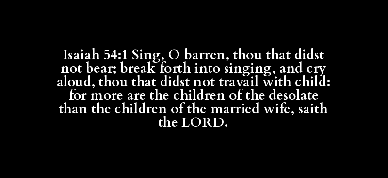 Isaiah 54:1 Sing, O barren, thou that didst not bear; break forth into singing, and cry aloud, thou that didst not travail with child: for more are the children of the desolate than the children of the married wife, saith the LORD.